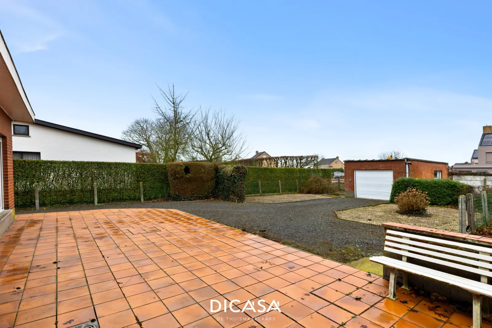 Achteraan het perceel bevinden zich een garage en bijkomende bergruimtes.