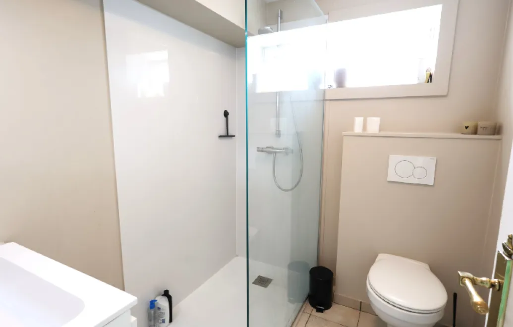 De keuken is voorzien van een spoeltafel, gasvuur en koelkast. De badkamer is voorzien van een badkamermeubel, douche en toilet.