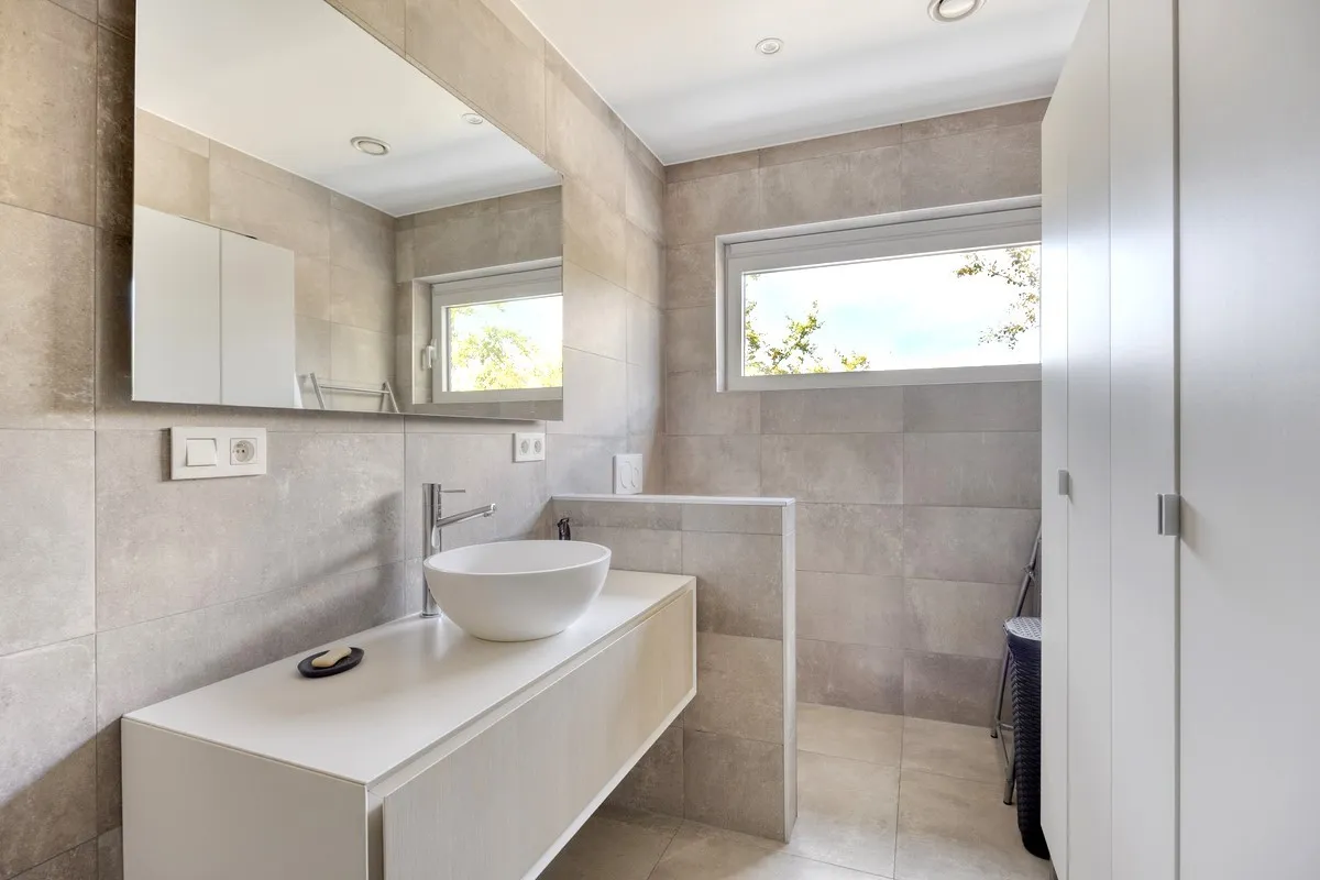 De woonverdieping omvat een hal, een ruime woonkamer met eetplaats en open keuken, een praktische berging, drie volwaardige slaapkamers en een badkamer. Vanuit de leefruimtes stap je rechtstreeks op het ruime zonneterras.