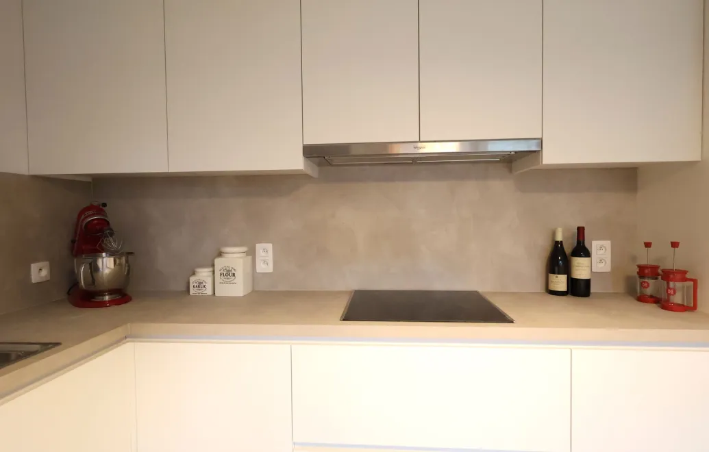 Via de woonkamer komen we tot in de nieuwe keuken, volledig uitgerust met een dubbele spoeltafel, vaatwasmachine, keramische kookplaat, dampkap, oven en koelkast. Aansluitend bevindt zich de praktische wasplaats/berging, ideaal voor extra opbergruimte.