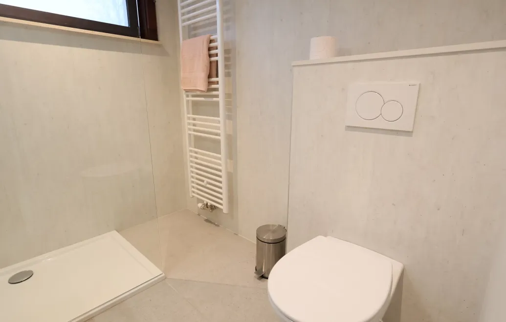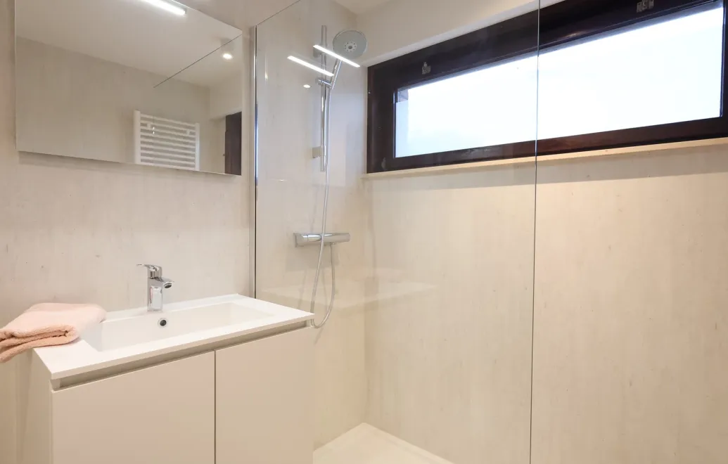Op de eerste verdieping bevinden zich drie volwaardige slaapkamers en een volledig vernieuwde badkamer, voorzien van een moderne inloopdouche, stijlvol badkamermeubel en toilet.