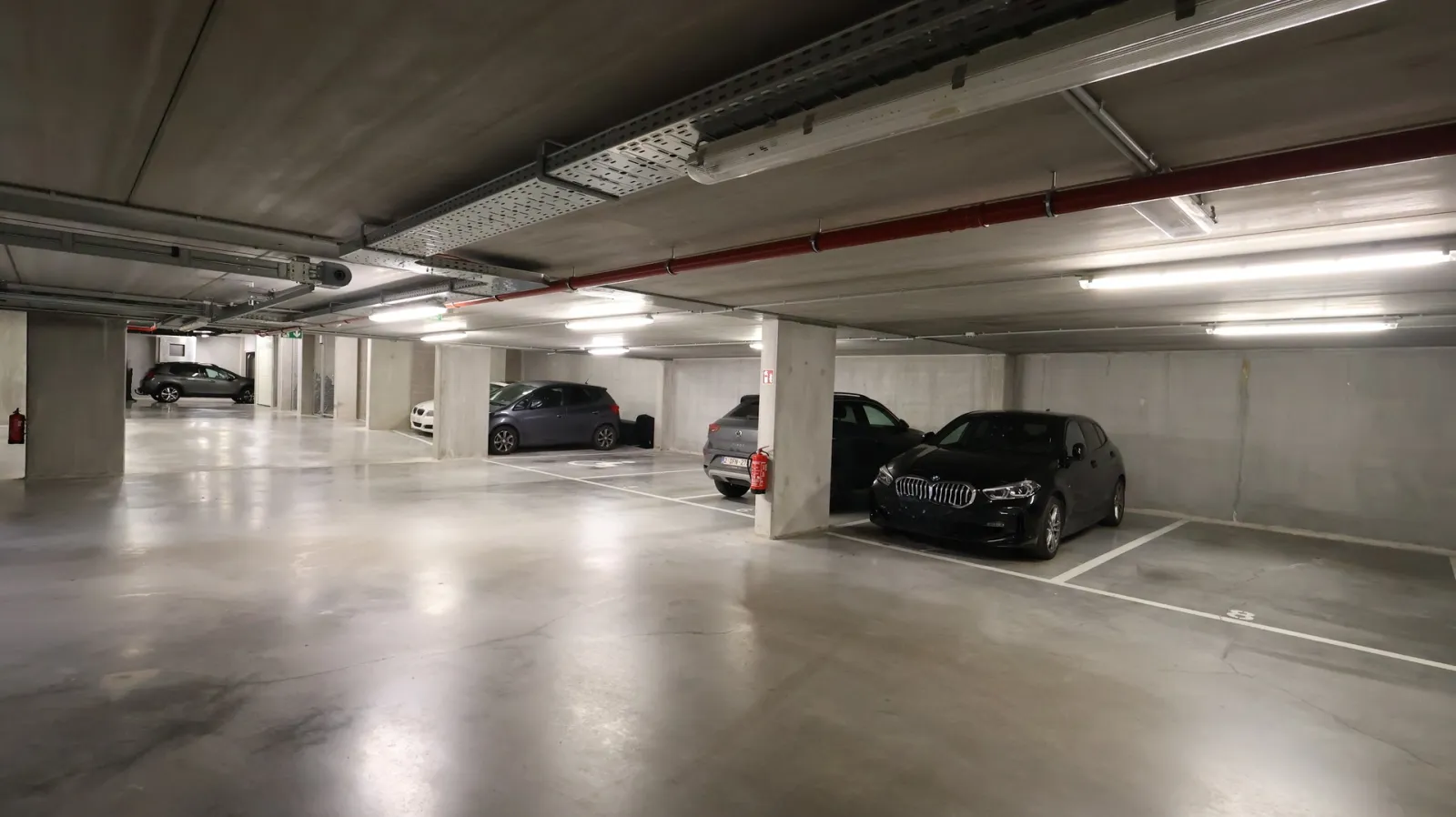 In het gebouw is een ondergrondse parkeergarage aanwezig, waar een autostandplaats is voorzien, verplicht bij te huren voor 65 euro per maand.