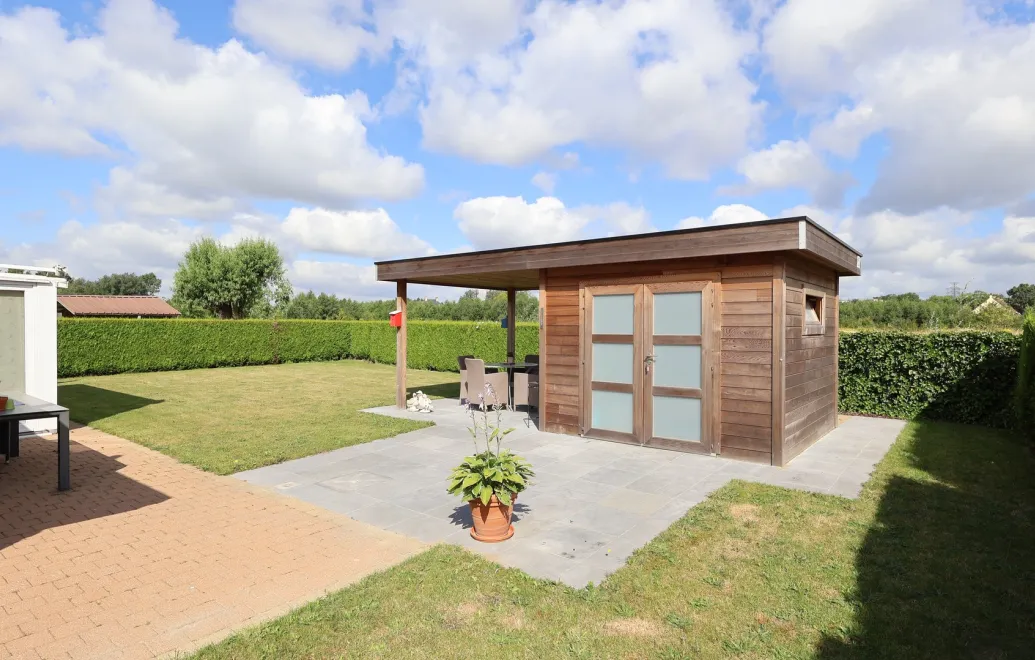 Achteraan de woning kunnen we een heerlijke, afgesloten tuin terugvinden, voorzien van een tuinhuis met afdek voor het plaatsen van een lounge.