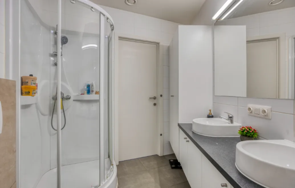 Verder beschikt het appartement over 1 slaapkamer met ingemaakte kasten, een badkamer met douche, toilet, dubbel lavabomeubel, opbergkasten en een afzonderlijke berging met aansluiting voor wasmachine.