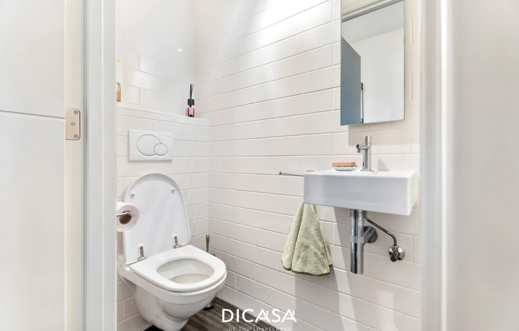 De inkomhal leidt naar het gastentoilet, de lichtrijke woonkamer, de open keuken met bijhorende keukenberging.