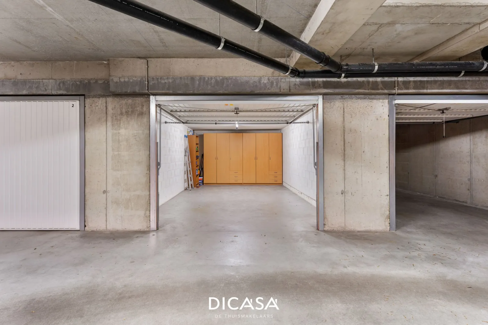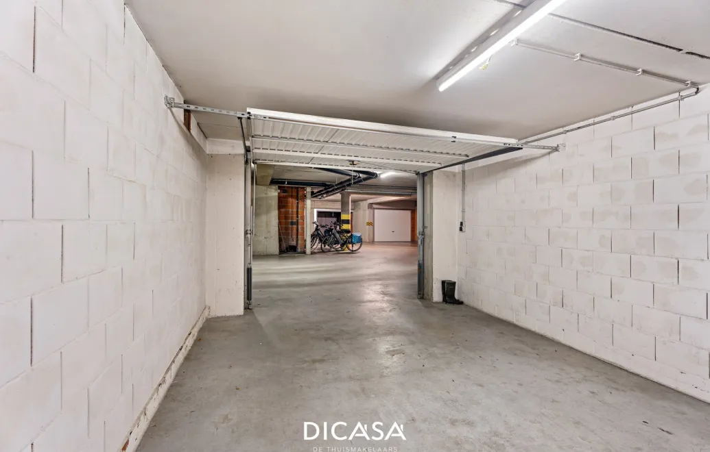 In de kelder bevindt zich een afgesloten garagebox, aan te kopen voor €42.000. Voor het gebouw is er bovendien een autostaanplaats, aan te kopen voor €12.000.