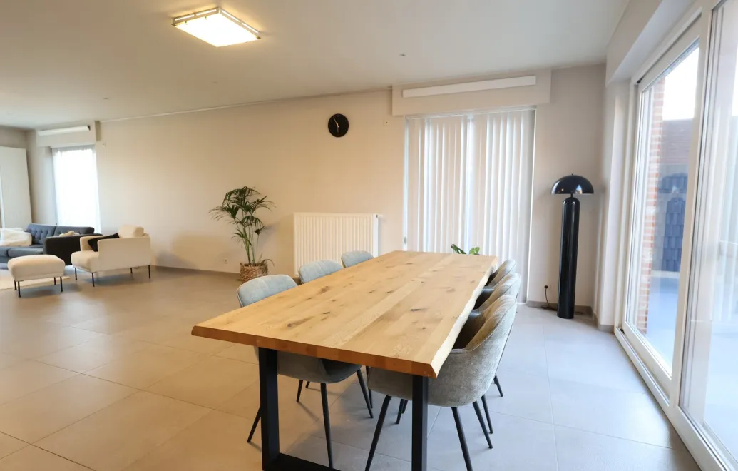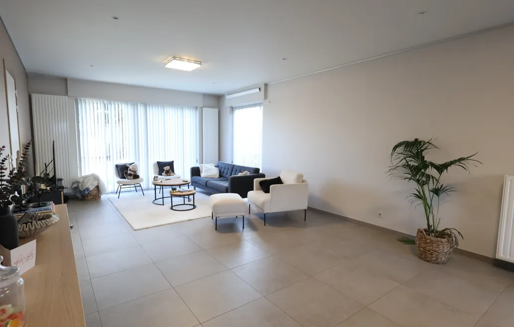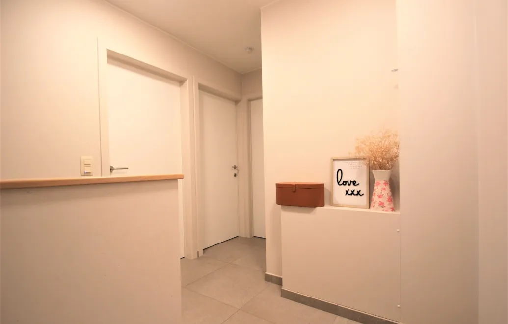 Bij het betreden van de woning kom je terecht in een ruime inkomhal met gastentoilet. De lichtrijke woonkamer en open leefkeuken vormen samen een gezellige en functionele leefruimte.
