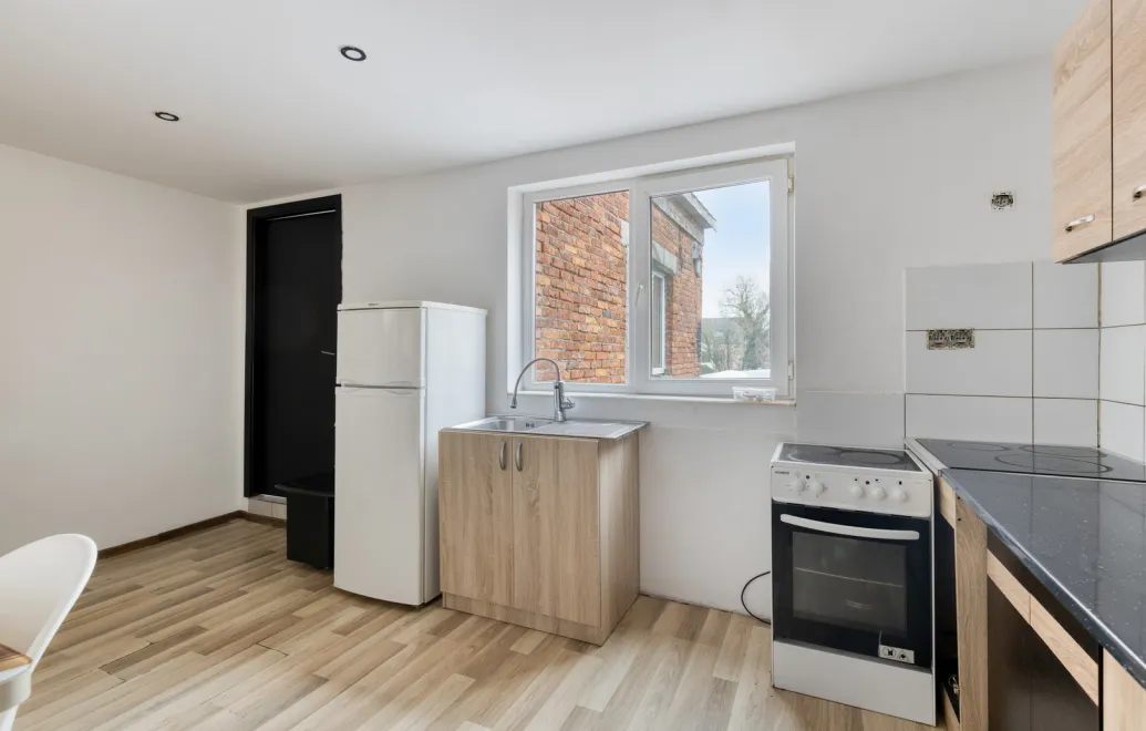 - Via de inkom bereik je het eerste verdiep, waar de nachthal toegang biedt tot twee slaapkamers, een woonkamer, een keuken en een badkamer. Dit verdiep biedt extra woonruimte en flexibiliteit binnen de woning.