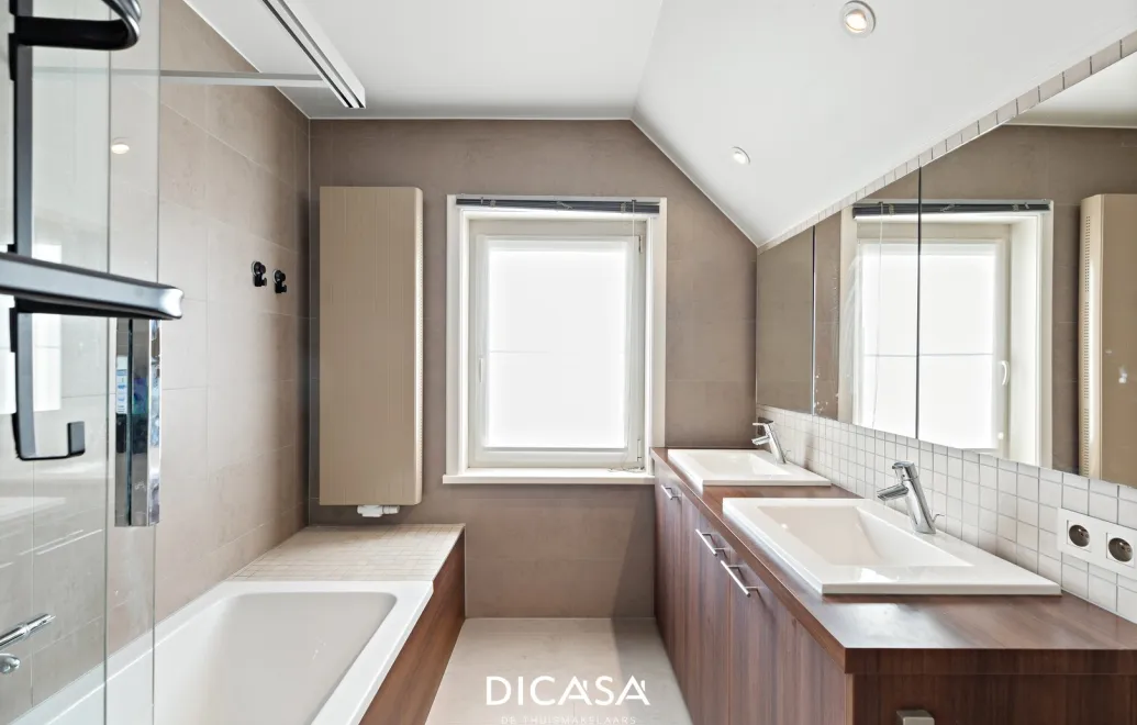 - Gelijkvloers: inkomhal met gastentoilet, lichtrijke leefruimte met ingebouwde gashaard, stijlvolle open keuken met veel opbergruimte, kwalitatieve inbouwtoestellen en Oosterse Zelliges. Aansluitend bevindt zich een praktische wasplaats met ingebouwde kasten en een extra douche, bereikbaar via een eiken schuifdeur. Daarnaast is er een ruime inpandige garage met automatische poort, bereikbaar via inkomhal en wasplaats.