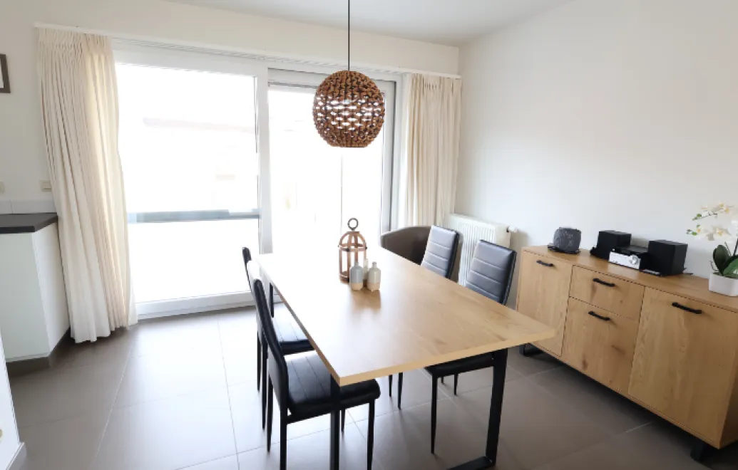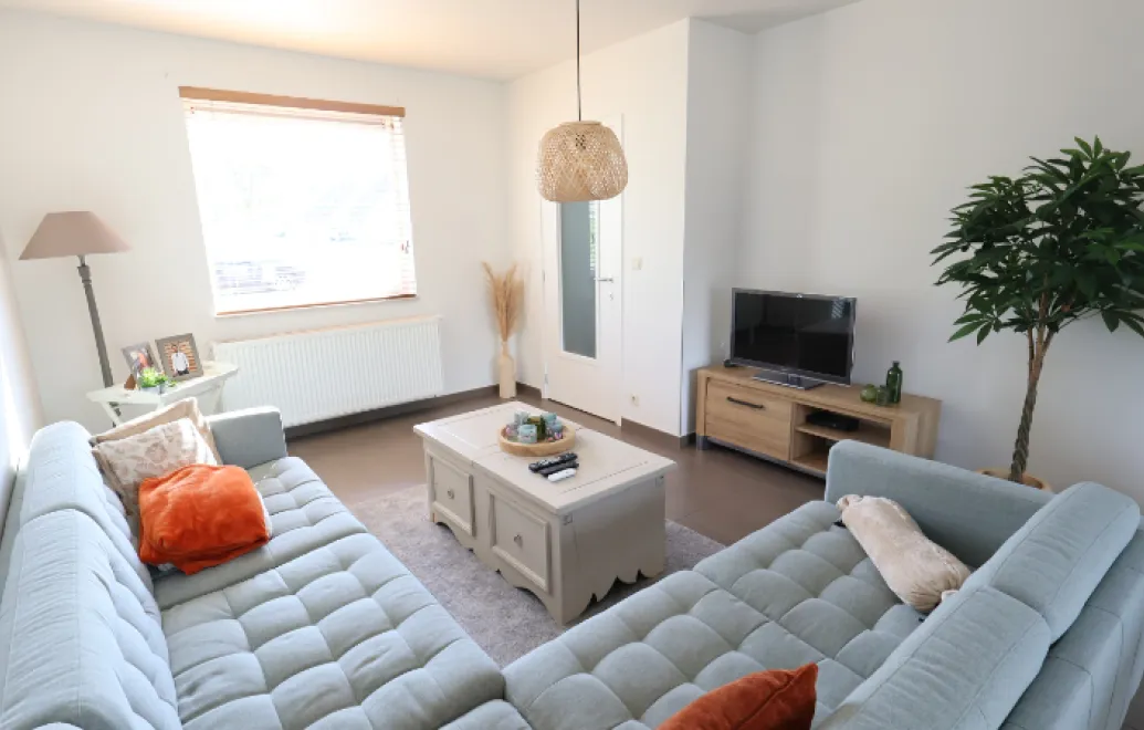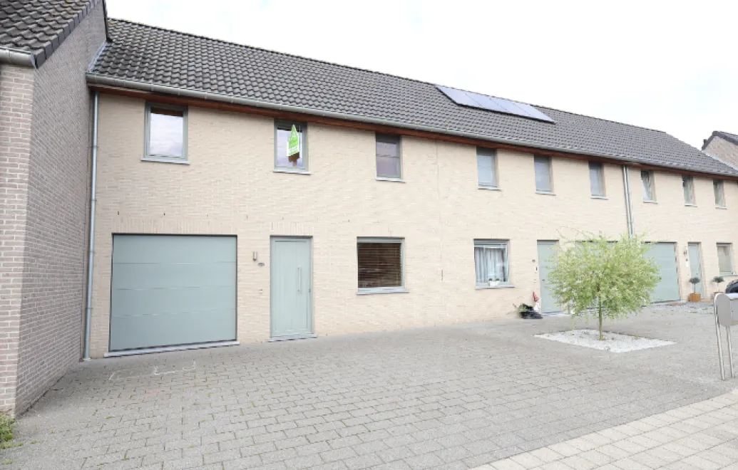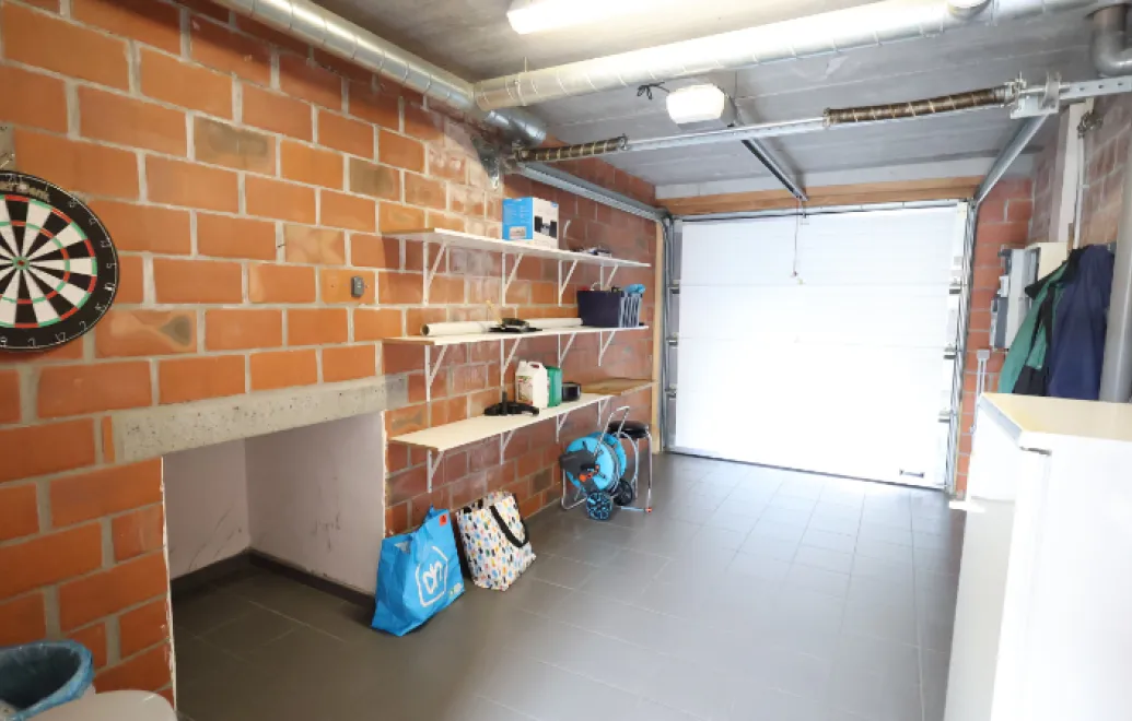 De woning bestaat op het gelijkvloers uit een inkomhal met gastentoilet, lichtrijke woonkamer met open keuken, garage met wasplaats en toegang tot de gezellige verharde tuin met tuinhuis.